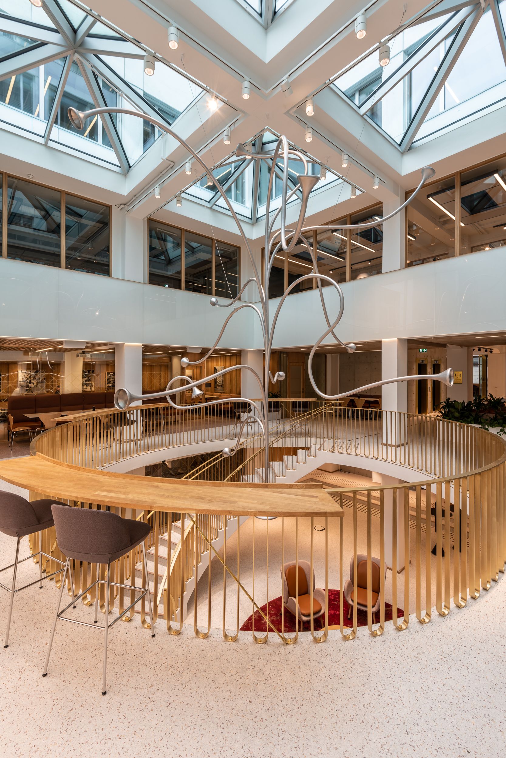 For Høiby er det også viktig med kontorer med karakter. Og det har ØV13 mye av. Interiøret er en oppgradering og forsterkning av funksjonalismens rasjonelle eleganse med solide og robuste materialvalg. Dette er forent med en moderne, eksklusiv estetikk, gjennom bruk av messing i rekkverk og detaljer, kombinert med lys terrazzo og eikefinér med spiler og eikegulv.