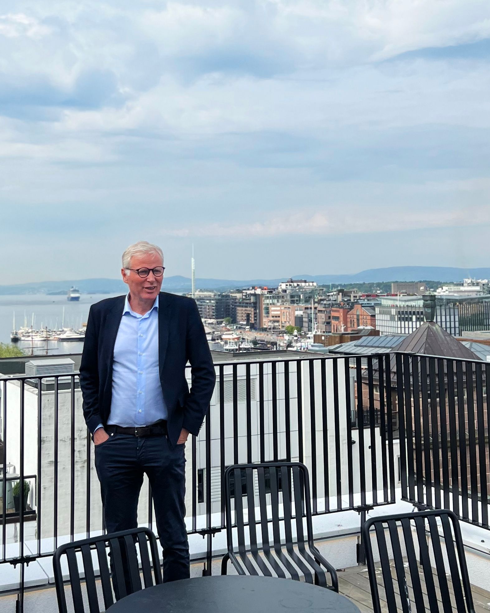 – Vi kom på befaring her i 8. etasje. Og det var så utrolig fint her oppe. Denne utsikten. Det er ganske unikt å se utover både Holmenkollen og fjorden, sier Per Høiby, daglig leder i rådgivningsselskapet First House, mens han viser rundt oppe på «taket», som de kaller det.